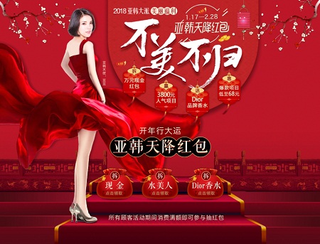 “亚韩天降红包礼, 2018不美不归”, 上门礼、拆万元现金红包、送品牌香水、赢人气项目、68元爆款项目.....你有没有心动?2018亚韩还有更多更大的美丽福利等你来!爱美的MM还在等什么,心动不如行动!希望遇见美好的事物,总要先让自己足够美好。拥有一个美丽的面容,定能带来自信以外的改变。在这个世界上,没有什么比“美”更正确。