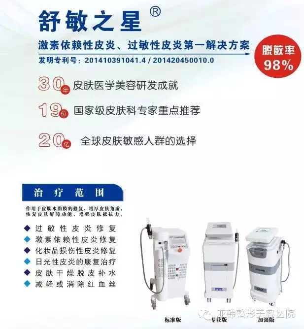 “激素依赖性皮炎、过敏性皮炎的解决方案”的舒敏之星拥有国际首创发明专利,四大核心技术修复敏感肌肤,直击敏感肌肤根源治疗有效率98%以上。